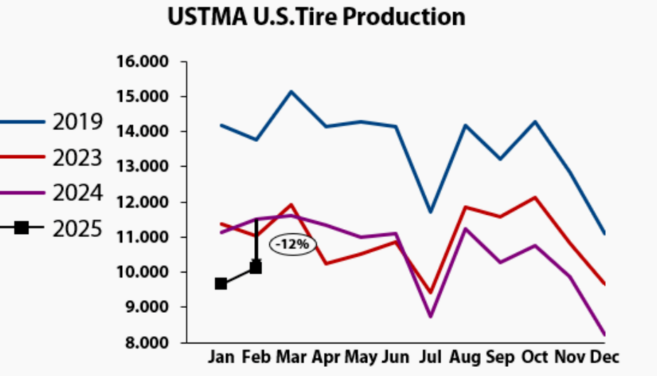 從歐勵隆提供的數(shù)據(jù)來看,美國輪胎產(chǎn)量在第一季度前兩個月下降了 12%,且仍大幅低于 COVID - 19 之前的水平。