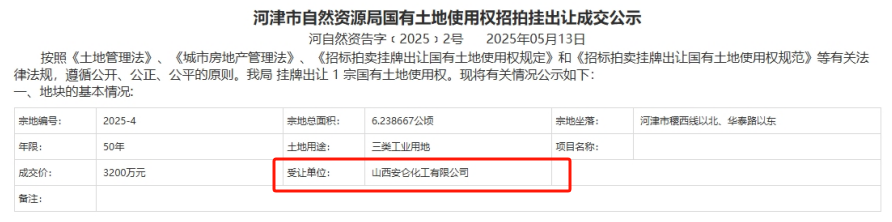 【炭黑產(chǎn)業(yè)網(wǎng)】6月4日消息,近日,山西省運(yùn)城市河津市成交1宗工業(yè)用地,該地塊最終由山西安侖化工有限公司成功競得。