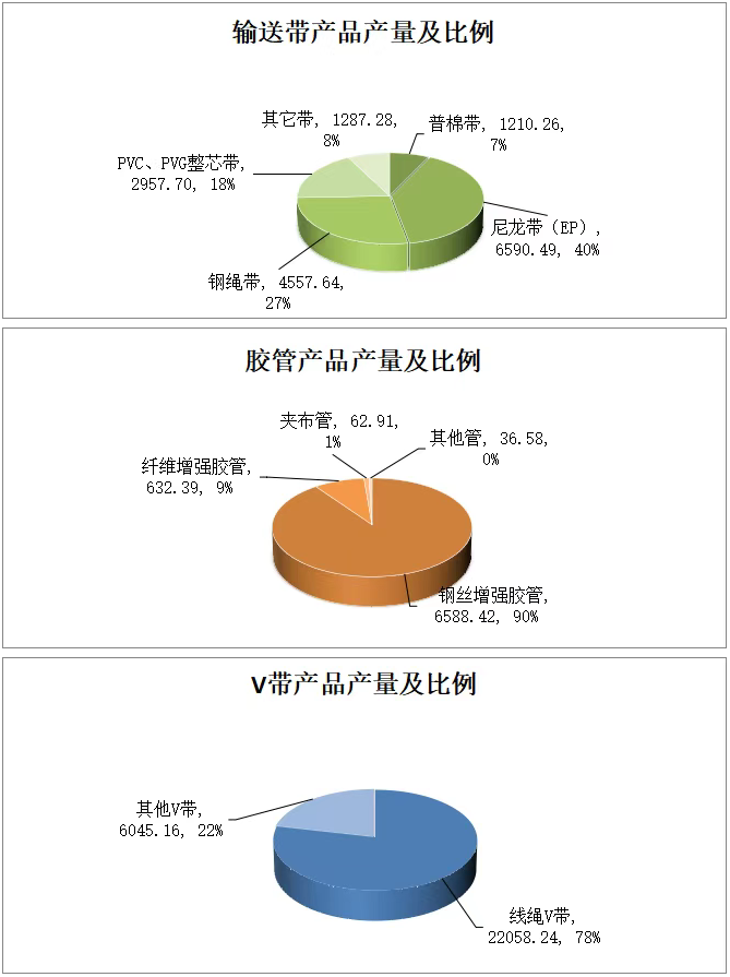主導(dǎo)產(chǎn)品輸送帶完成1.81億㎡,同比增長2.54%;其中:鋼繩帶完成0.46億㎡,同比增長1.65%;輕型輸送帶完成173.45萬㎡,同比增長35.34%;膠管完成1.32億Bm,同比增長9.63%;其中:鋼絲增強(qiáng)膠管完成0.66億Bm,同比增長9.42%;汽車專用膠管完成1.49億根,同比增長19.94%;橡膠履帶完成12.55萬條,同比增長20.10%;V帶完成2.81億Am,同比增長8.02%;其中:線繩V帶完成2.21億Am,同比增長7.41%;汽車專用V帶完成0.24條,同比下降1.87%。