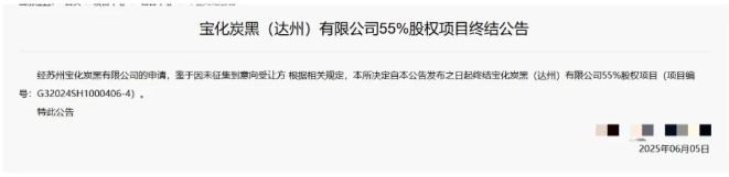 【炭黑產(chǎn)業(yè)網(wǎng)】6月11日消息,近日,經(jīng)蘇州寶化炭黑有限公司的申請,鑒于因未征集到意向受讓方,某產(chǎn)權(quán)交易機構(gòu)最新一次宣布終止寶化炭黑(達(dá)州)有限公司55%股權(quán)轉(zhuǎn)讓項目。