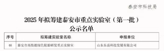 【炭黑產(chǎn)業(yè)網(wǎng)】6月18日消息,近日,泰安市科技局公布了2025年首批擬籌建的泰安市重點實驗室名單,東岳輪胎憑借其在輪胎技術(shù)創(chuàng)新與產(chǎn)品研發(fā)方面的突出表現(xiàn),成功躋身其中。這一榮譽(yù)的獲得,無疑是對東岳輪胎長期以來堅持科技創(chuàng)新、不斷突破自我的有力肯定,也為公司在輪胎技術(shù)領(lǐng)域的持續(xù)發(fā)展注入了新的動力。