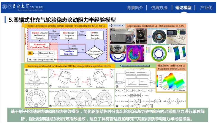 1.非充氣輪胎內(nèi)外循環(huán)熱力耦合仿真和輻條PVDF壓電應變測量仿真方面開展了研究。解決了非充氣輪胎非連續(xù)輻條的熱力耦合滾阻特性仿真與溫度場計算的難題,并在此基礎上提出了穩(wěn)態(tài)滾動阻力半經(jīng)驗模型,實現(xiàn)了對已參數(shù)識別非充氣輪胎不同工況下的滾阻高精度預測。