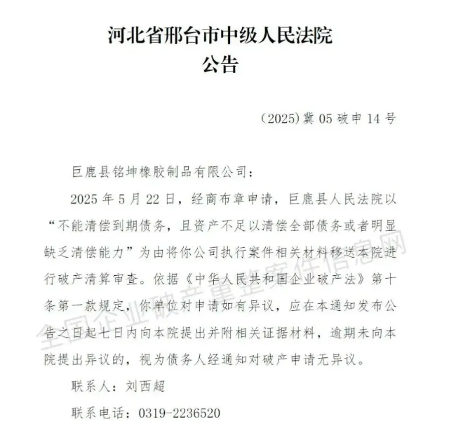 債務(wù)危機(jī)壓頂!巨鹿銘坤橡膠啟動(dòng)破產(chǎn)清算審查程序