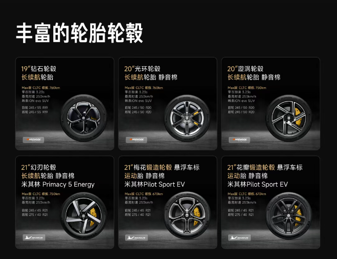 而對(duì)于那些對(duì)競(jìng)速性能有更高追求的用戶,21 英寸梅花鍛造輪轂和 21 英寸花瓣鍛造輪轂搭配內(nèi)置隔音棉的米其林 Pilot Sport EV 運(yùn)動(dòng)胎,無(wú)疑是最佳之選,Max 版車(chē)型可實(shí)現(xiàn) CLTC 續(xù)航 670km。