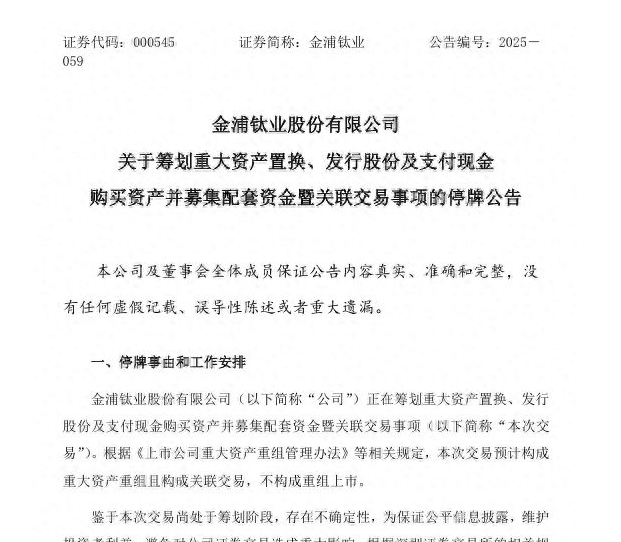 根據(jù)公告內(nèi)容,金浦鈦業(yè)計(jì)劃將部分資產(chǎn)及負(fù)債作為擬置出資產(chǎn)參與此次交易,不過(guò)目前具體的置出資產(chǎn)范圍尚在商議確定中。值得關(guān)注的是,本次交易預(yù)計(jì)將構(gòu)成重大資產(chǎn)重組,但并不會(huì)觸發(fā)重組上市的條件。公司已向相關(guān)部門(mén)申請(qǐng),其股票自 7 月 1 日起正式停牌,預(yù)計(jì)在不超過(guò) 10 個(gè)交易日內(nèi),會(huì)向市場(chǎng)披露完整的交易方案。