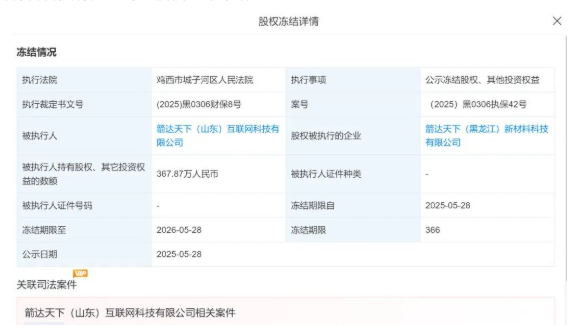 近日,箭達(dá)天下(山東)互聯(lián)網(wǎng)科技有限公司持有箭達(dá)天下(黑龍江)新材料科技有限公司的股權(quán)遭遇凍結(jié)。