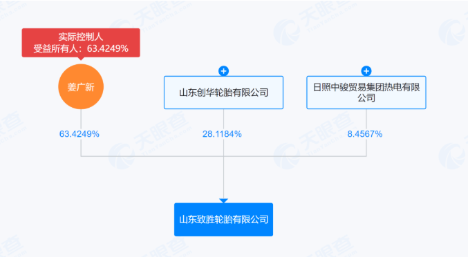 根據(jù)天眼查數(shù)據(jù)顯示,山東致勝輪胎有限公司最大股東為姜廣新,還有兩位股東分別為山東創(chuàng)華輪胎有限公司、日照中駿貿(mào)易集團熱電有限公司。