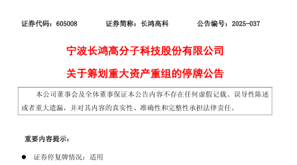 【炭黑產(chǎn)業(yè)網(wǎng)】7月8日消息,寧波長(zhǎng)鴻高分子科技股份有限公司(以下簡(jiǎn)稱“長(zhǎng)鴻高科”)于 7 月 7 日晚間對(duì)外公布《關(guān)于籌劃重大資產(chǎn)重組的停牌公告》。此次資產(chǎn)重組被視作該公司在新材料領(lǐng)域深化戰(zhàn)略布局、培育新質(zhì)生產(chǎn)力以及增強(qiáng)產(chǎn)業(yè)鏈競(jìng)爭(zhēng)力的關(guān)鍵一步。