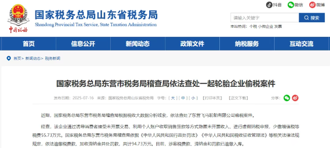 【炭黑產(chǎn)業(yè)網(wǎng)】7 月 18 日消息,東營(yíng)飛馬輪胎有限公司近期再曝違法違規(guī)行為,國(guó)家稅務(wù)總局東營(yíng)市稅務(wù)局稽查局通過(guò)稅收大數(shù)據(jù)分析鎖定線索后,依法對(duì)該企業(yè)的偷稅案件展開(kāi)查處并作出處理。
