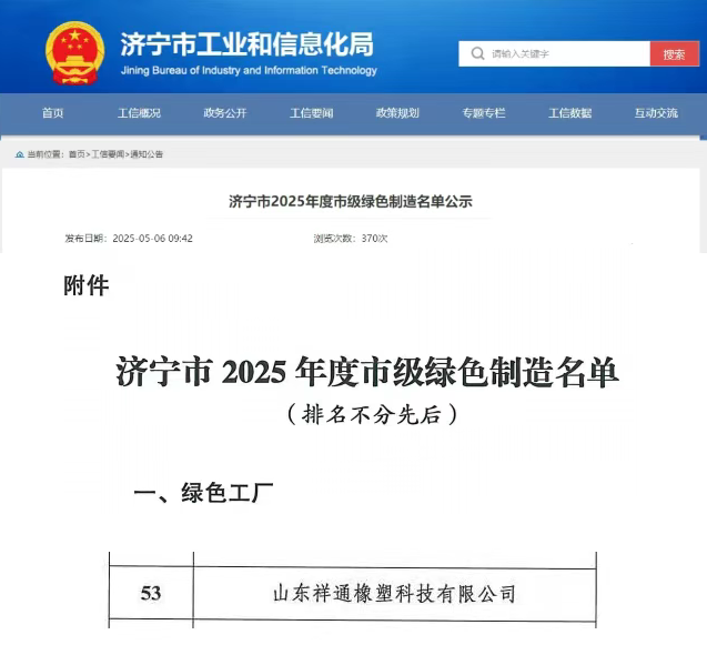 【炭黑產(chǎn)業(yè)網(wǎng)】7 月 18 日消息,濟(jì)寧市工業(yè)和信息化局近期公示了 2025 年度市級(jí)綠色制造名單,山東祥通橡塑科技有限公司憑借在清潔生產(chǎn)實(shí)施、資源循環(huán)利用及供應(yīng)鏈綠色協(xié)作等領(lǐng)域的優(yōu)異表現(xiàn),成功入選并獲得 “2025 年市級(jí)綠色工廠” 稱號(hào)。