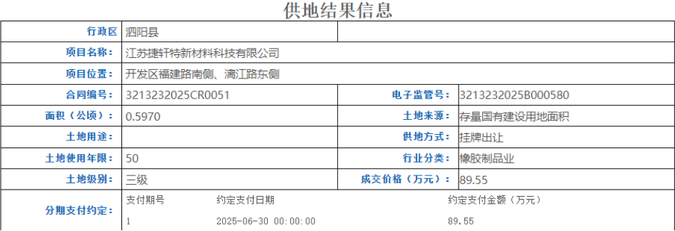 據(jù)炭黑產(chǎn)業(yè)網(wǎng)了解,今年 6 月 30 日,該企業(yè)出資 89.55 萬元,成功競得 5970 平方米的工業(yè)土地。相關(guān)資料顯示,江蘇捷軒特新材料科技有限公司成立于 2024 年 10 月,注冊資本為 2000 萬元,法定代表人為翁自全,主營業(yè)務(wù)包括輪胎的制造與銷售等。值得關(guān)注的是,該公司具有港資背景,香港企業(yè)格瑞達(dá)有限公司持有其 35.5% 的股份。