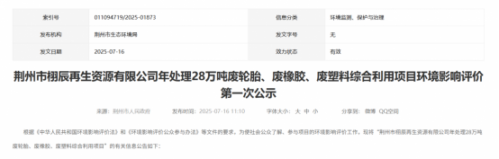 7月16日,荊州市生態(tài)環(huán)境局發(fā)布了關(guān)于荊州市栩辰再生資源有限公司年處理 28 萬噸廢輪胎、廢橡膠、廢塑料綜合利用項(xiàng)目環(huán)境影響評(píng)價(jià)第一次公示。