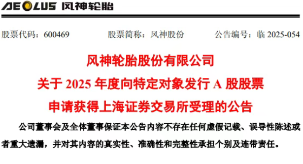 【炭黑產(chǎn)業(yè)網(wǎng)】8 月 18 日消息,2025 年 8 月 17 日晚間,國內(nèi)輪胎行業(yè)的重要企業(yè)風(fēng)神股份(600469.SH)發(fā)布公告,宣布其 2025 年度向特定對象發(fā)行 A 股股票的申請已獲得上海證券交易所正式受理。這一消息的公布,意味著該公司一項(xiàng)重大的資本運(yùn)作以及戰(zhàn)略擴(kuò)張計劃正式拉開了帷幕。