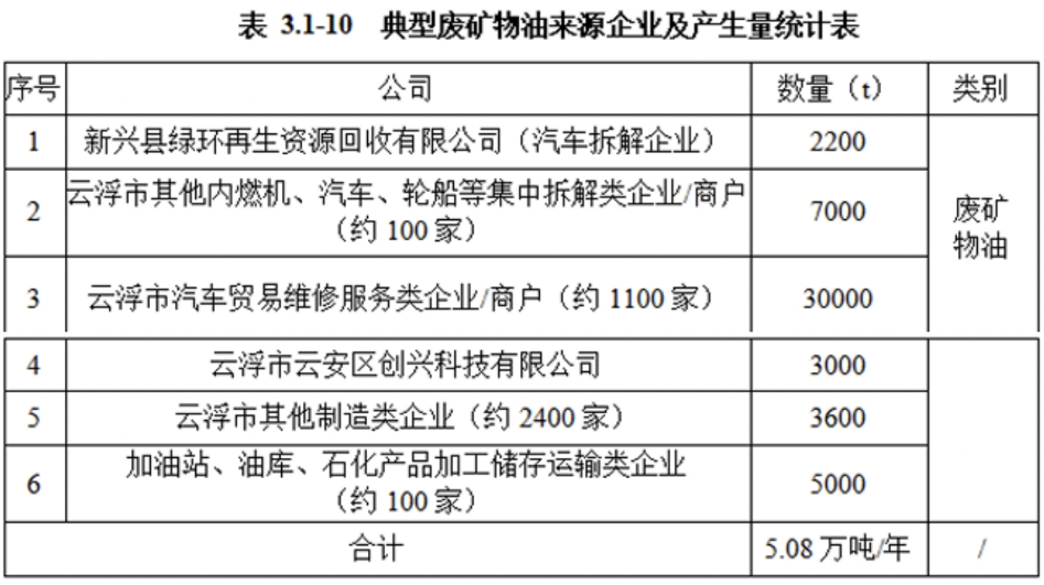 通過(guò)市場(chǎng)調(diào)查,據(jù)不完全統(tǒng)計(jì),本項(xiàng)目擬收集的廢礦物油主要來(lái)自①云浮市共有汽車貿(mào)易維修服務(wù)類企業(yè)/商戶約1200家,廢礦物油收集處理量約6.82萬(wàn)噸/年。②制造業(yè)約2400家,廢礦物油收集處理量約1.32萬(wàn)噸/年。③加油站、油庫(kù)、石化產(chǎn)品加工儲(chǔ)存運(yùn)輸類企業(yè)約100家,廢礦物油收集處理量約1萬(wàn)噸。