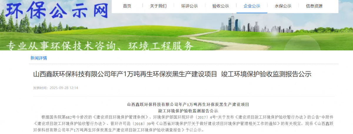 9月28日,《山西鑫躍環(huán)保科技有限公司年產(chǎn)1萬(wàn)噸再生環(huán)保炭黑生產(chǎn)建設(shè)項(xiàng)目竣工環(huán)境保護(hù)驗(yàn)收調(diào)查報(bào)告》公示。