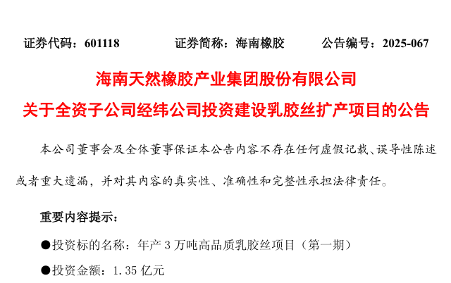 海南橡膠產(chǎn)業(yè)集團股份有限公司(證券代碼:601118,簡稱“海南橡膠”)10月31日發(fā)布公告稱,公司全資子公司海南經(jīng)緯乳膠絲有限責任公司(簡稱“經(jīng)緯公司”)擬投資1.35億元建設年產(chǎn)3萬噸高品質乳膠絲項目(第一期)。項目建成后,經(jīng)緯公司乳膠絲年產(chǎn)能將新增1.5萬噸,進一步鞏固其行業(yè)龍頭地位。