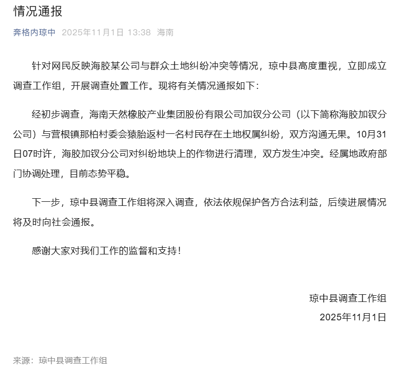 11月1日,瓊中縣調(diào)查工作組發(fā)布情況通報(bào),對(duì)網(wǎng)民反映的“海膠某公司與群眾土地糾紛沖突”情況作出說(shuō)明。通報(bào)稱(chēng),瓊中縣對(duì)此高度重視,已第一時(shí)間成立調(diào)查工作組開(kāi)展調(diào)查處置。