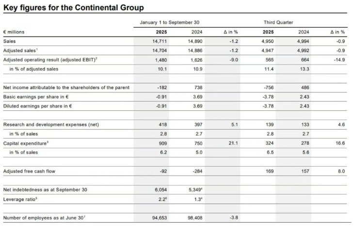 據(jù)炭黑產(chǎn)業(yè)網(wǎng)了解,2025年第三季度大陸集團合并銷售額達到49.5億歐元(約合405.9億人民幣),較去年同期小幅下降0.9%;若剔除匯率波動及整合范圍調整的因素,公司有機銷售額同比增長2.6%。集團調整后營業(yè)利潤為5.65億歐元(約46.33億人民幣),同比下滑14.9%,而去年同期調整后息稅前利潤因緯湃科技(Vitesco Technologies)支付的1.25億歐元一次性款項出現(xiàn)大幅增長。本季度調整后息稅前利潤率為11.4%,低于2024年第三季度的13.3%。