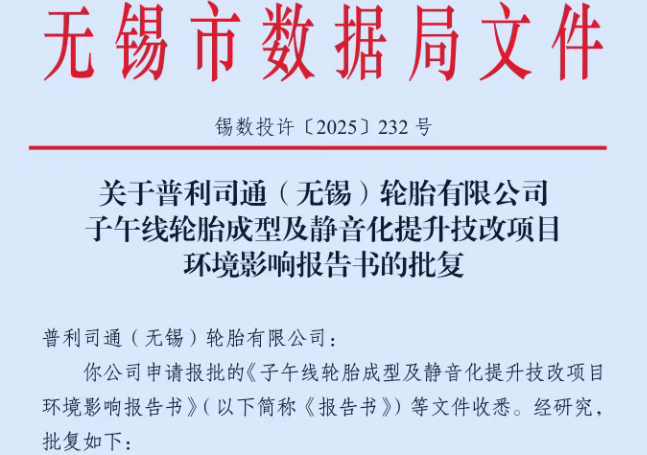 【炭黑產(chǎn)業(yè)網(wǎng)】11 月 10 日消息,普利司通(無錫)輪胎有限公司的 “子午線輪胎成型及靜音化提升技改項目” 于 2025 年 10 月 31 日正式取得無錫市數(shù)據(jù)局環(huán)保批復(fù)(批復(fù)文號:錫數(shù)投許〔2025〕232 號)。標志著該工廠在高端化升級與綠色化轉(zhuǎn)型的進程中實現(xiàn)關(guān)鍵突破,將通過技術(shù)革新進一步強化其在高端輪胎市場的競爭力。