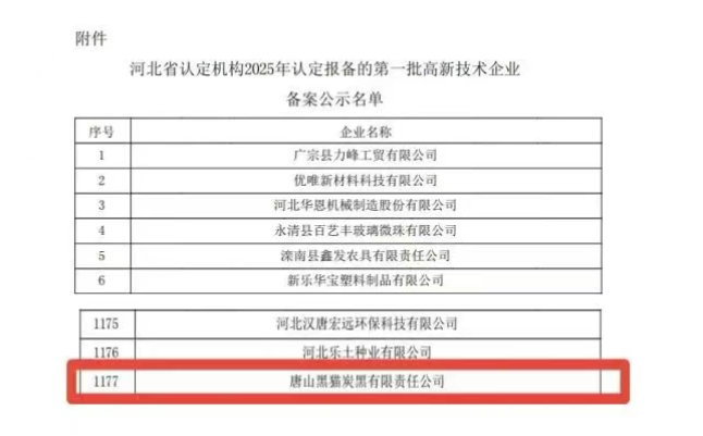 在本次公示名單中,唐山黑貓?zhí)亢谟邢挢?zé)任公司赫然在列,其序號(hào)為1177。值得關(guān)注的是,這已是該公司繼2015年、2018年、2022年之后,第四次成功被認(rèn)定為國(guó)家高新技術(shù)企業(yè),充分彰顯了企業(yè)在技術(shù)創(chuàng)新領(lǐng)域的持續(xù)深耕與突出實(shí)力。