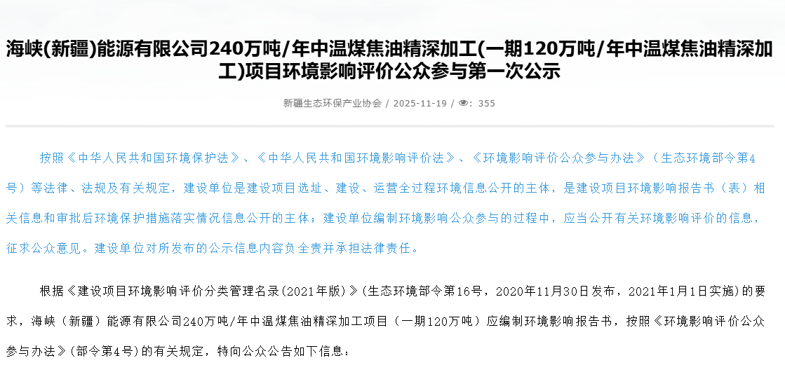 11月19日,海峽(新疆)能源有限公司240萬(wàn)噸/年中溫煤焦油精深加工(一期120萬(wàn)噸/年中溫煤焦油精深加工)項(xiàng)目環(huán)境影響評(píng)價(jià)公眾參與第一次公示。