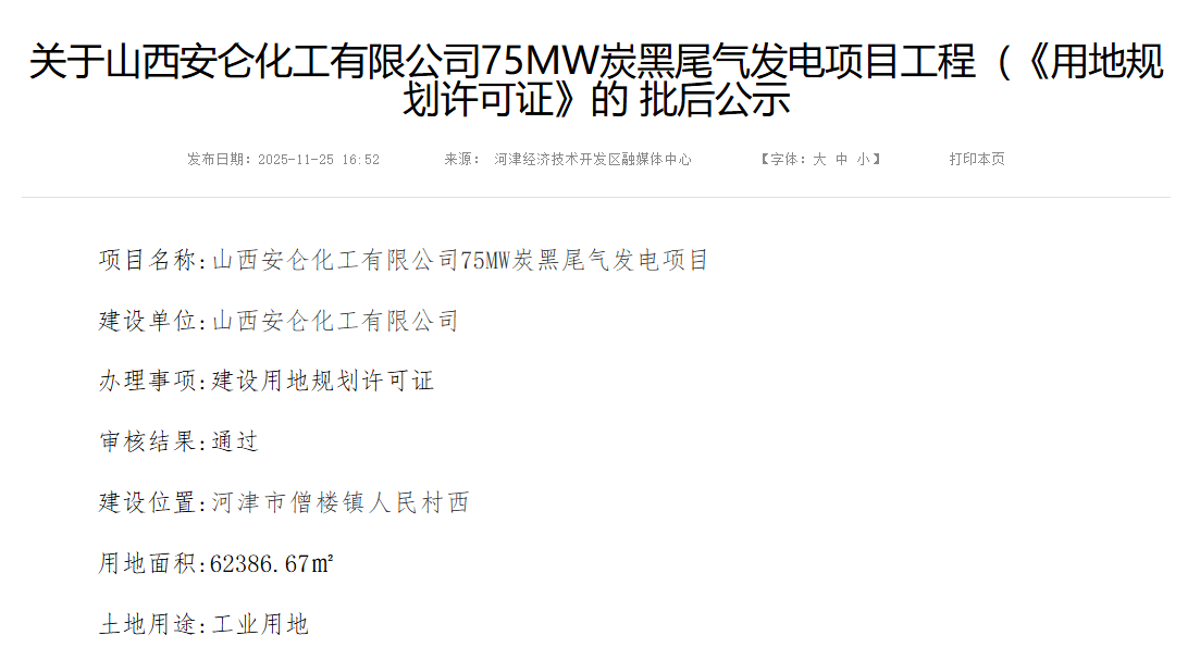 安侖炭黑尾氣發(fā)電項目,獲建設(shè)用地許可