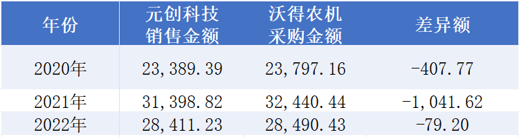 此外,元創(chuàng)科技與供應商溫州良工的合作時長“穿越”,首輪問詢回復稱合作16年,而溫州良工成立于2014年5月,至今也未成立超16年。核心大客戶采銷數(shù)據(jù)也“迷霧重重”,2020年至2022年,公司與第一大客戶沃得農機披露的銷售金額存在差異,產品單價更是“南轅北轍”,另一大客戶濰柴雷沃采購價也與元創(chuàng)科技自述售價差距顯著。同時,公司招股書與大客戶披露的往來款項持續(xù)“錯位”,2020年至2022年公司對沃得農機的應收賬款金額與沃得農機同期披露的對元創(chuàng)科技應付賬款存在數(shù)百萬元差異。