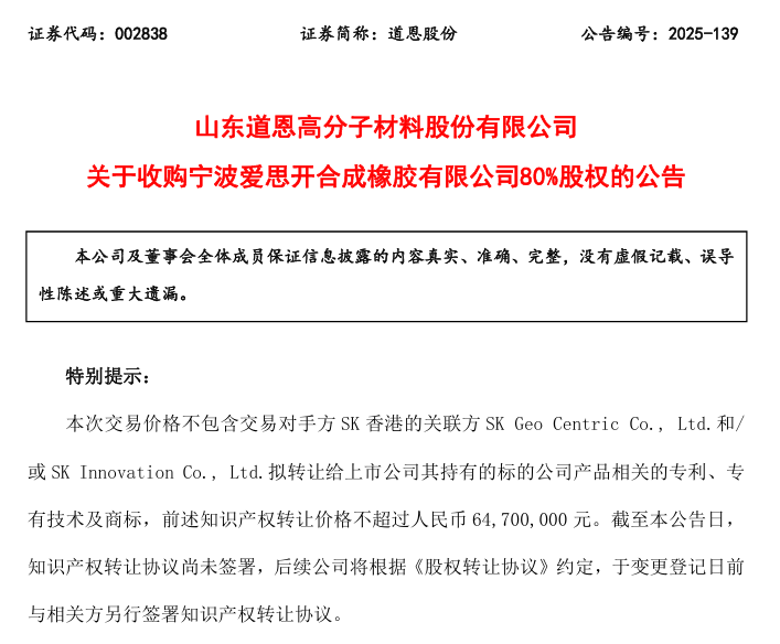 為維持寧波愛思開股權(quán)交割后的運營,其產(chǎn)品相關(guān)知識產(chǎn)權(quán)將由 SK 關(guān)聯(lián)方轉(zhuǎn)讓至道恩股份,轉(zhuǎn)讓協(xié)議需于股權(quán)變更前簽訂,價格上限為 6470 萬元。