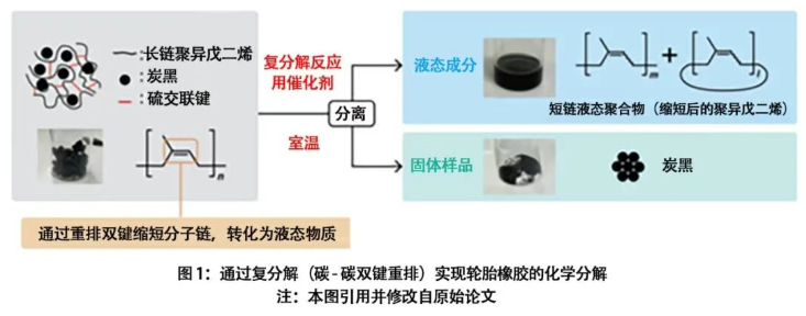 一直以來,天然橡膠類的聚異戊二烯可借助催化復分解反應實現(xiàn)便捷分解,但廢舊輪胎中的硫化聚異戊二烯橡膠卻因硫成分會抑制復分解反應,成為回收領(lǐng)域的一大難題。為此,研究團隊將突破口放在為輪胎橡膠匹配適宜的催化劑與溶劑上,以此實現(xiàn)交聯(lián)結(jié)構(gòu)聚異戊二烯在溫和的近常溫條件下的化學分解。從工藝原理來看,分子間復分解反應會讓聚異戊二烯分子間的碳 - 碳雙鍵重排,不過生成的分子鏈長度不均,難以直接獲取短分子鏈;而分子內(nèi)復分解反應則會催生環(huán)狀聚異戊二烯,進而實現(xiàn)分子鏈的縮短。