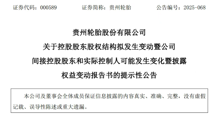 【炭黑產(chǎn)業(yè)網(wǎng)】12月18日消息,2025年12月16日,國內(nèi)輪胎行業(yè)迎來一則重磅消息,貴州輪胎(000589.SZ)發(fā)布公告,宣告其控股股東股權(quán)將發(fā)生重大變動,這一變動將使公司實際控制人層級上移,開啟“省管”新篇章。