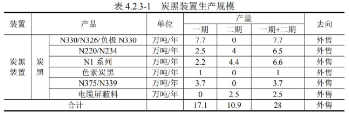 一期工程設(shè)置5條生產(chǎn)線,產(chǎn)能為17.1萬噸/a炭黑;二期工程新增3條生產(chǎn)線,新增炭黑產(chǎn)量10.9萬噸。