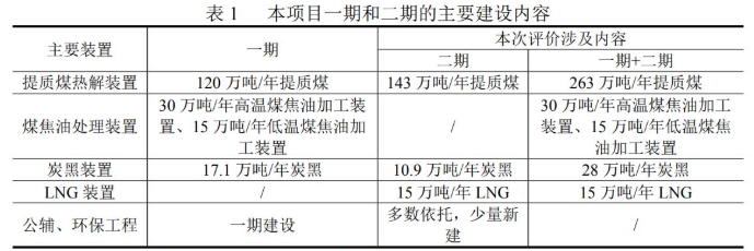 項(xiàng)目分兩期建設(shè),全廠建設(shè)產(chǎn)能為28萬噸/年炭黑生產(chǎn)裝置、263萬噸/年提質(zhì)煤熱解裝置、30 萬噸/年高溫煤焦油加工裝置、15萬噸/年低溫煤焦油加工裝置、15萬噸/年LNG及配套公輔設(shè)施及環(huán)保工程。其中,一期工程已編制了環(huán)境影響評(píng)價(jià)報(bào)告;因項(xiàng)目為上下游產(chǎn)業(yè)鏈?zhǔn)剑虼吮敬卧u(píng)價(jià)對(duì)二期工程和二期工程建設(shè)后的內(nèi)容,進(jìn)行評(píng)價(jià)。