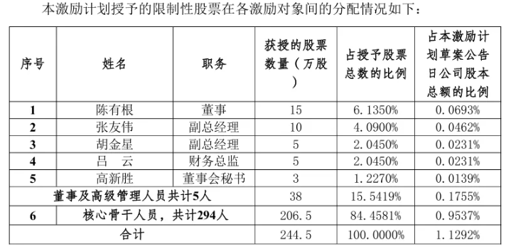 該激勵計劃采取的激勵工具為限制性股票,股票來源為公司從二級市場回購的公司A股普通股股票。計劃擬授予激勵對象的限制性股票數(shù)量為2,445,000股,占本激勵計劃草案公告日公司股本總額216,526,960股的1.1292%。