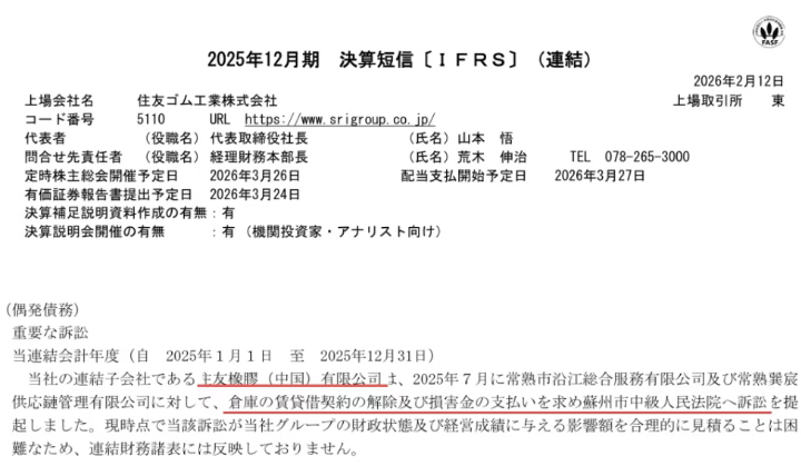 此外,財(cái)報(bào)還披露了住友橡膠常熟工廠近期在法律訴訟方面的情況。該工廠在蘇州市中級(jí)人民法院對(duì)兩家國內(nèi)企業(yè)提起了訴訟,涉及倉庫租賃糾紛,并要求支付賠償金。盡管財(cái)報(bào)并未說明具體涉訴金額,但特意提及此事,引發(fā)了外界對(duì)賠償金額可能不小的猜測(cè)。截至2月14日,該案尚未被收錄在企業(yè)工商信息查詢平臺(tái)的司法案件中。