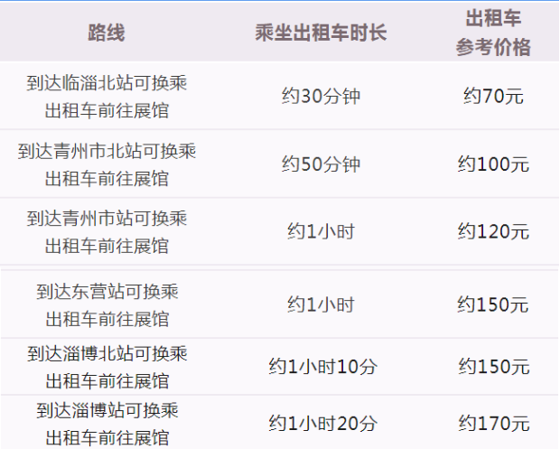 (可選擇乘坐高鐵至臨淄北站、青州市北站、青州市站、淄博北站、淄博站、東營(yíng)站等站點(diǎn)下車(chē),再換乘出租車(chē)前往展館。)