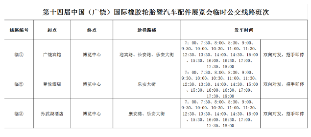 為全方位、多角度滿足輪胎展期間廣大市民、參觀人員乘車(chē)需要,決定自5月15日至17日輪胎展期間,分別開(kāi)通廣饒賓館、宇通尊悅國(guó)際酒店、華泰孫武湖溫泉度假酒店至廣饒國(guó)際博覽中心3條臨時(shí)公交線路,采取不固定公交站點(diǎn),雙向?qū)Πl(fā),招手即停方式,方便乘客出行。