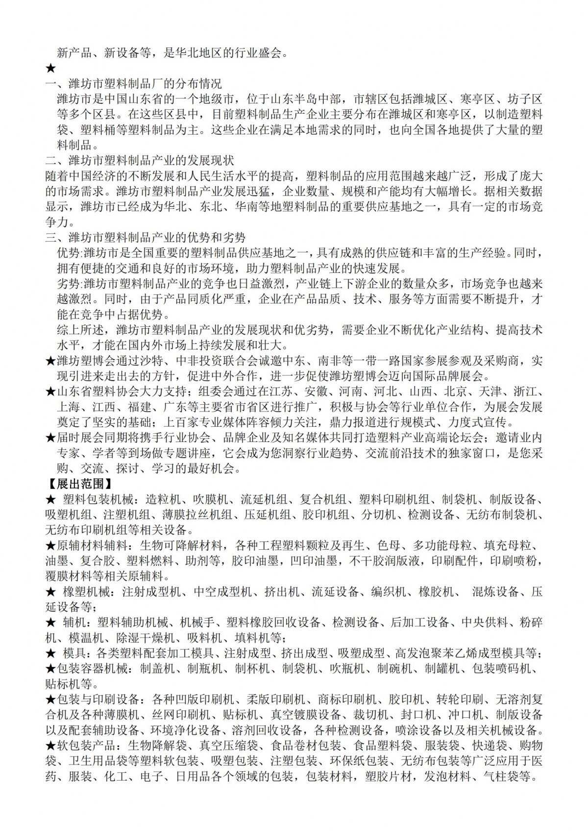 臨沂國際塑料工業(yè)展覽會(臨沂塑料包裝印刷展)是山東大型塑料工業(yè)展覽價值平臺,為塑料行業(yè)提供展示平臺,有效促進塑料行業(yè)的交流、貿(mào)易合作和技術創(chuàng)新。這是您購買、交流、討論和學習的最佳機會。臨沂國際塑料工業(yè)展覽會有來自國內(nèi)外400多家知名企業(yè)參加,如浙江正威、