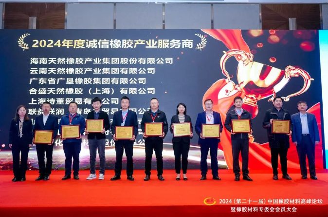 中國橡膠工業(yè)協(xié)會橡膠材料專委會秘書長王小芳、合盛天然橡膠(上海)有限公司總經(jīng)理王學(xué)峰、雙錢輪胎集團有限公司安環(huán)運營部總監(jiān)何穎,分別主持各時段的會議。會上頒發(fā)了2024年度“誠信橡膠產(chǎn)業(yè)服務(wù)商”、“誠信橡膠貿(mào)易商”證書,中國橡膠工業(yè)協(xié)會副秘書長、輪胎分會秘書長史一鋒,海南天然橡膠產(chǎn)業(yè)集團股份有限公司黨委副書記、總經(jīng)理楊宇,中國橡膠工業(yè)協(xié)會橡膠材料專業(yè)委員會顧問侯鳳霞分別為獲選單位頒發(fā)證書。