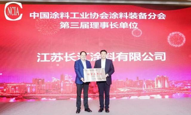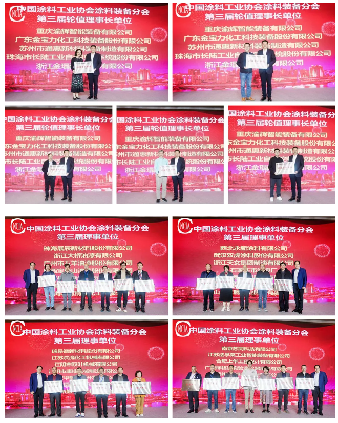 會中,劉普軍會長為中國涂料工業(yè)協(xié)會涂料裝備分會第三屆理事會理事長單位江蘇長江涂料有限公司,副理事長單位重慶渝輝智能裝備有限公司、廣東金寶力化工科技裝備股份有限公司、蘇州市通惠新材料裝備制造有限公司、珠海市長陸工業(yè)自動控制系統(tǒng)股份有限公司、浙江金琨西立鋯珠有限公司授牌,張衛(wèi)中理事長為理事單位授牌。劉普軍會長、張衛(wèi)中理事長為首任輪值理事長單位重慶渝輝智能裝備有限公司授旗。