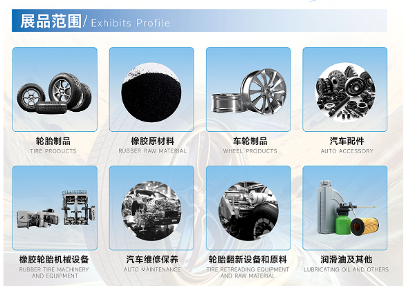 展會(huì)將全面展示輪胎制品、橡膠原材料、車輪制品、汽車配件、橡膠輪胎機(jī)械設(shè)備、汽車維修保養(yǎng)、輪胎翻新設(shè)備及原料、潤(rùn)滑油及其他等展品。