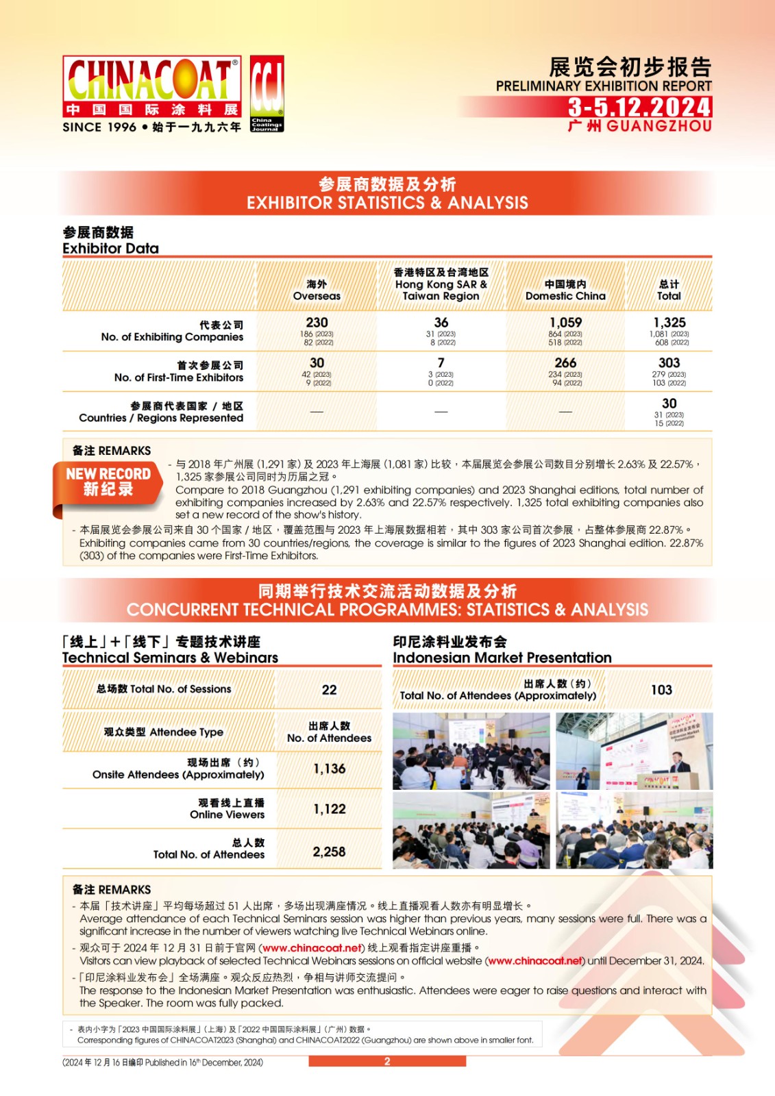 同期舉行技術(shù)交流活動現(xiàn)場出席人數(shù):1,239名,參與22場專題技術(shù)講座及1場印尼涂料業(yè)發(fā)布會。