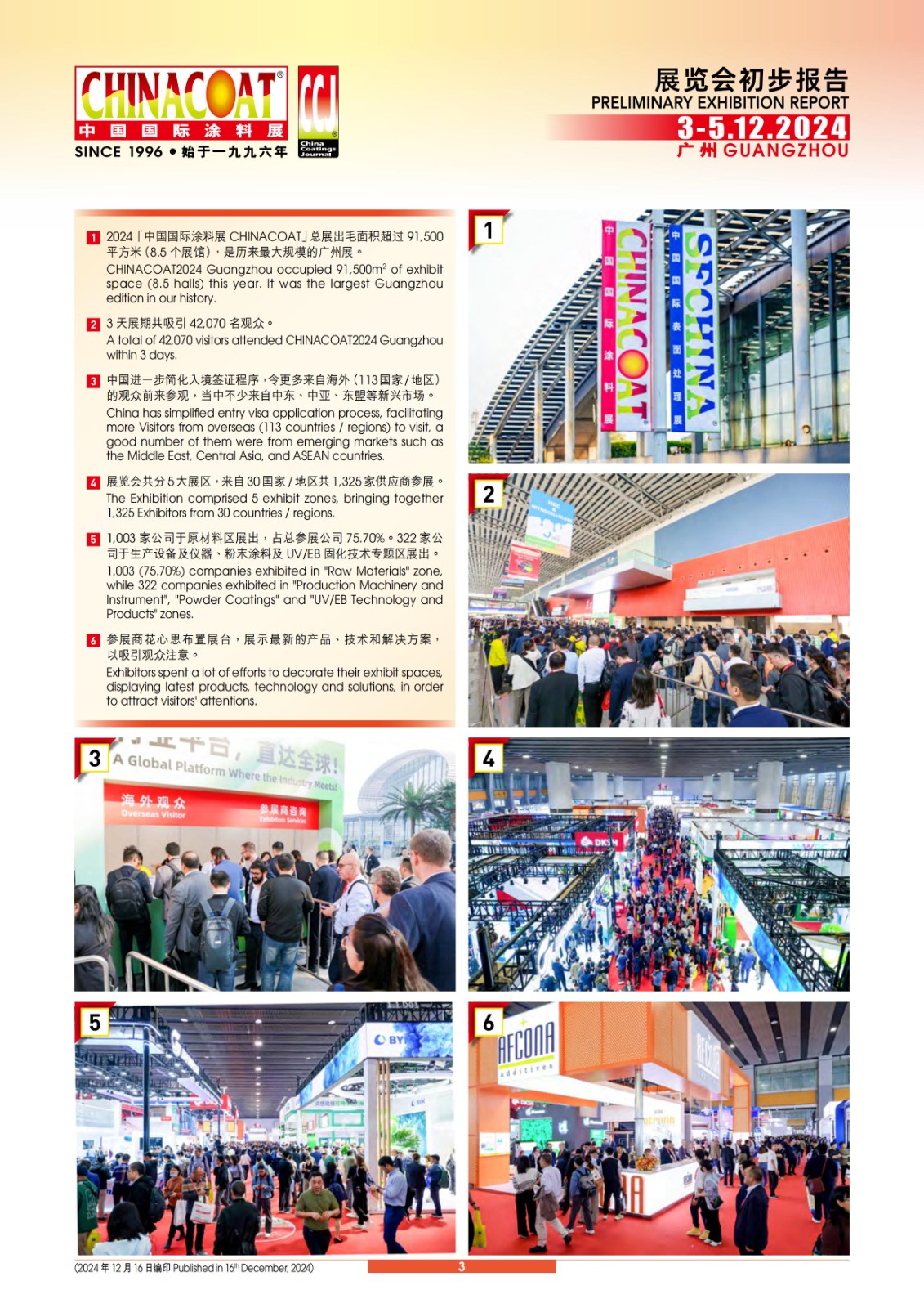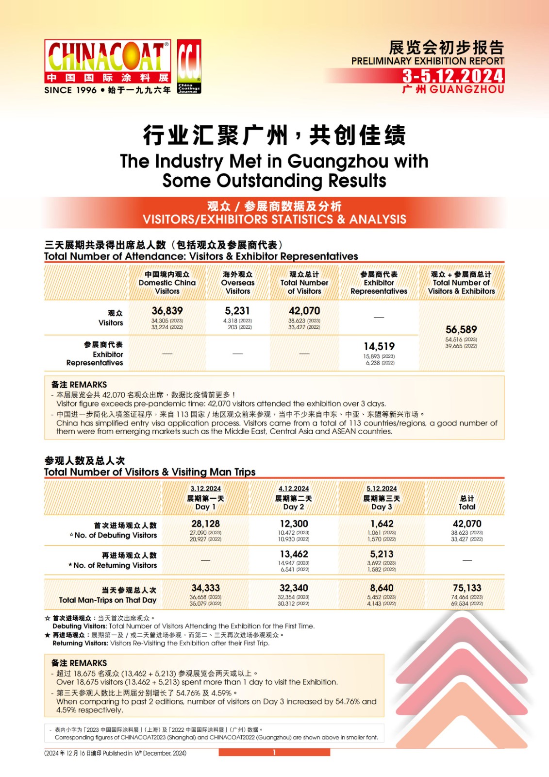 為期三天的2024「中國國際涂料展CHINACOAT」于12月5日在廣州中國進(jìn)出口商品交易會展館A區(qū)圓滿落幕。展覽會總面積超過91,500平方米,來自30個國家/地區(qū)1,325家參展商(展覽會新紀(jì)錄!)向來自113個國家/地區(qū)42,070名觀眾展示其創(chuàng)新產(chǎn)品技術(shù)、可持續(xù)解決方案和行業(yè)發(fā)展趨勢。這是歷來最大規(guī)模的廣州展,凸顯展覽會對全球涂料行業(yè)日益增長的影響力。以下是本屆展覽會一些初步數(shù)據(jù):