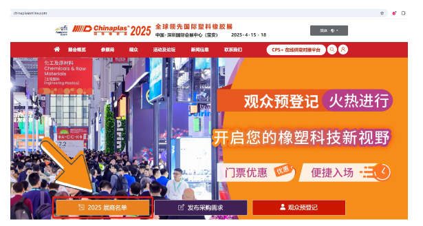 在瀏覽器中輸入www.chinaplasonline.com,打開CHINAPLAS官網(wǎng)首頁,點擊“2025展商名單”即可快速查閱。