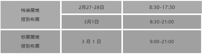 各位展商請(qǐng)于2月27日-3月1日,8:30-17:30,到「物流通道7號(hào)門」報(bào)到,請(qǐng)攜帶名片或身份證及參展合同領(lǐng)取參展證件,進(jìn)館前展位費(fèi)需要支付全部款項(xiàng)。