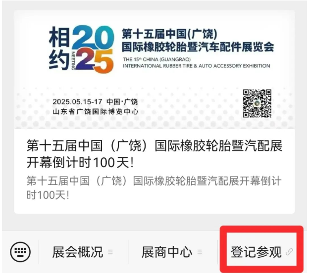 進(jìn)入微信公眾號(hào)“輪胎展”,點(diǎn)擊右下角“登記參觀”,即可查看二維碼憑證。