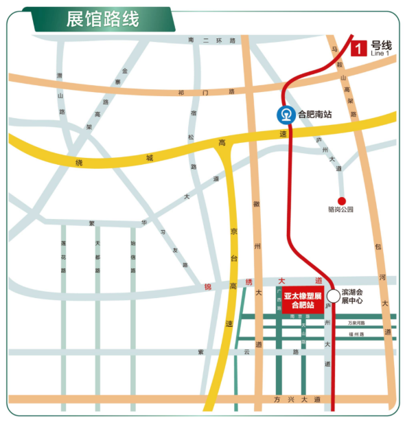 從合肥南站乘坐地鐵1號(hào)線,經(jīng)過(guò)4站即可到達(dá)合肥濱湖國(guó)際會(huì)展中心。