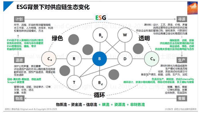 呂博士在會議上指出,當(dāng)下社會商業(yè)活動正經(jīng)歷重大變革,人口、氣候、資源、環(huán)境等多方面因素讓消費(fèi)市場的價值訴求發(fā)生改變,營商環(huán)境也因此發(fā)生巨大改變,企業(yè)如果需要發(fā)展就需要建設(shè)新的商業(yè)生態(tài),走可持續(xù)商業(yè)生態(tài),而當(dāng)下ESG發(fā)展現(xiàn)狀在企業(yè)端、技術(shù)端、政策法規(guī)端、投資金融市場端、議題端都呈現(xiàn)出多種發(fā)展形態(tài),但是無疑都體現(xiàn)出:在當(dāng)下和未來ESG已經(jīng)成為貿(mào)易和經(jīng)營的戰(zhàn)略要素并成為企業(yè)管理的重要工具。而在ESG背景下對供應(yīng)鏈生態(tài)的變化如下: