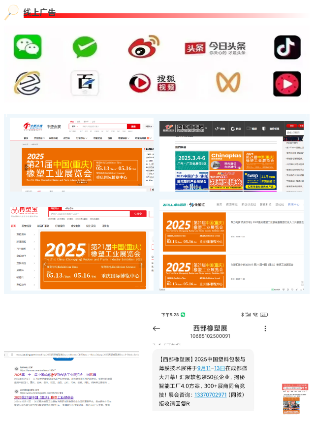六大展區(qū)精準對接,深度鏈接橡塑全產(chǎn)業(yè)鏈,從原料到銷售一站式覆蓋深入“展會+產(chǎn)業(yè)”模式,聯(lián)動橡塑上中下游多個環(huán)節(jié),聚焦橡塑機械裝備、輔助設(shè)備及模具、橡塑原材料、塑料回收和再生主題、生物降解材料及制品、復合材料六大展區(qū)企業(yè),是品牌推廣、市場開拓及行業(yè)趨勢發(fā)展的專業(yè)化平臺。