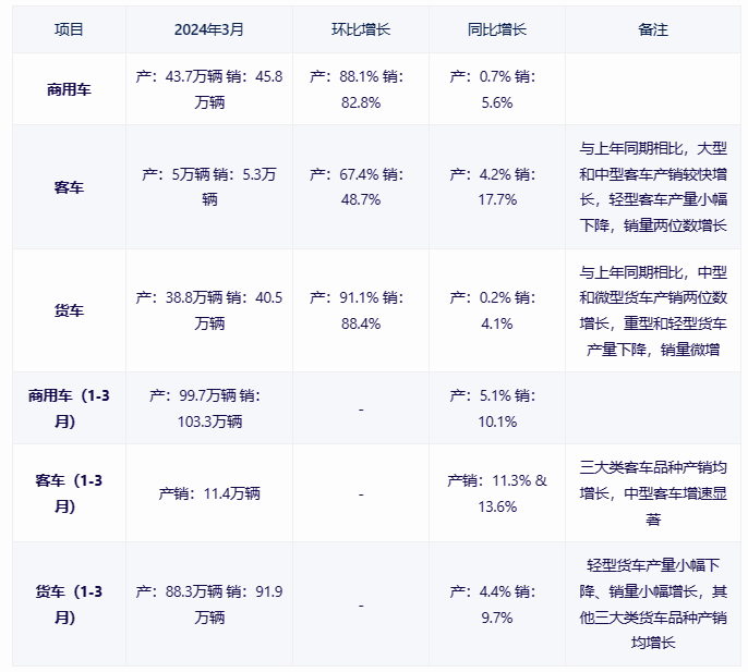 從2024年前三個(gè)月的累計(jì)數(shù)據(jù)來看,商用車產(chǎn)量為99.7萬輛,銷量為103.3萬輛,同比分別增長5.1%和10.1%。在客車細(xì)分市場中,前三個(gè)月的產(chǎn)銷量均達(dá)到11.4萬輛,同比分別增長11.3%和13.6%,其中中型客車的增長速度最為明顯。貨車市場在前三個(gè)月也保持著穩(wěn)健的增長態(tài)勢,產(chǎn)銷量分別為88.3萬輛和91.9萬輛,同比實(shí)現(xiàn)了一定的增長。