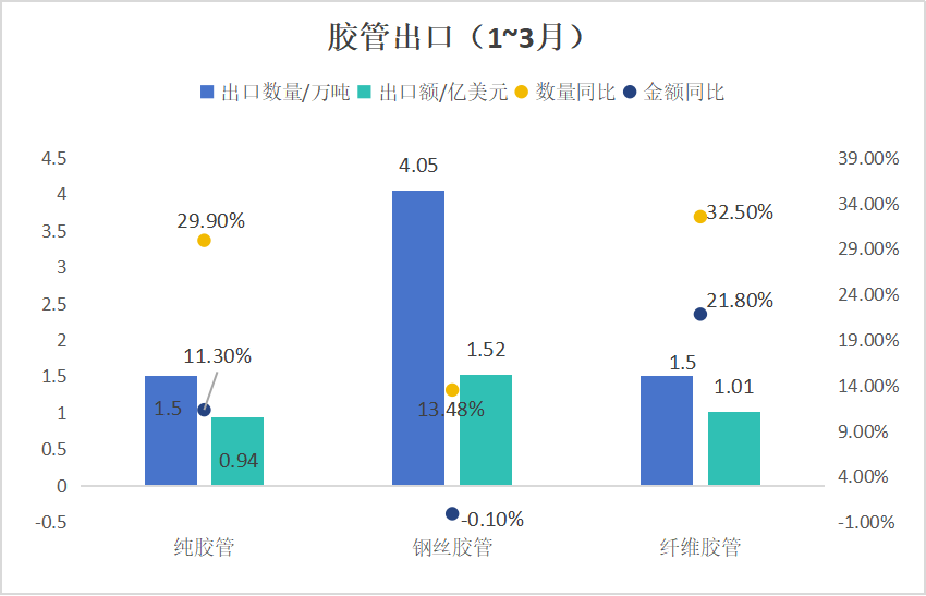 2024年一季度膠管出口總量為7.92萬(wàn)噸,同比增長(zhǎng)率為25.3%,出口總額實(shí)現(xiàn)10.4%的增長(zhǎng),達(dá)到3.82億美元。然而,出口均價(jià)出現(xiàn)了11.9%的下滑,降至4820美元/噸。其中,純膠管出口量同比增長(zhǎng)29.9%,達(dá)到1.5萬(wàn)噸,同時(shí)出口額也增長(zhǎng)了11.3%,達(dá)到0.94億美元,出口均價(jià)下滑了14.3%,為6243美元/噸。鋼絲膠管的出口量也有13.48%的增長(zhǎng),總量達(dá)到4.05萬(wàn)噸,出口額有輕微的0.1%下滑,至1.52億美元,出口均價(jià)下跌了12%,降至3768美元/噸。纖維膠管出口量增長(zhǎng)32.5%,達(dá)到1.5萬(wàn)噸,出口額增長(zhǎng)21.8%,達(dá)到1.01億美元,出口均價(jià)下降8%至6647美元/噸。